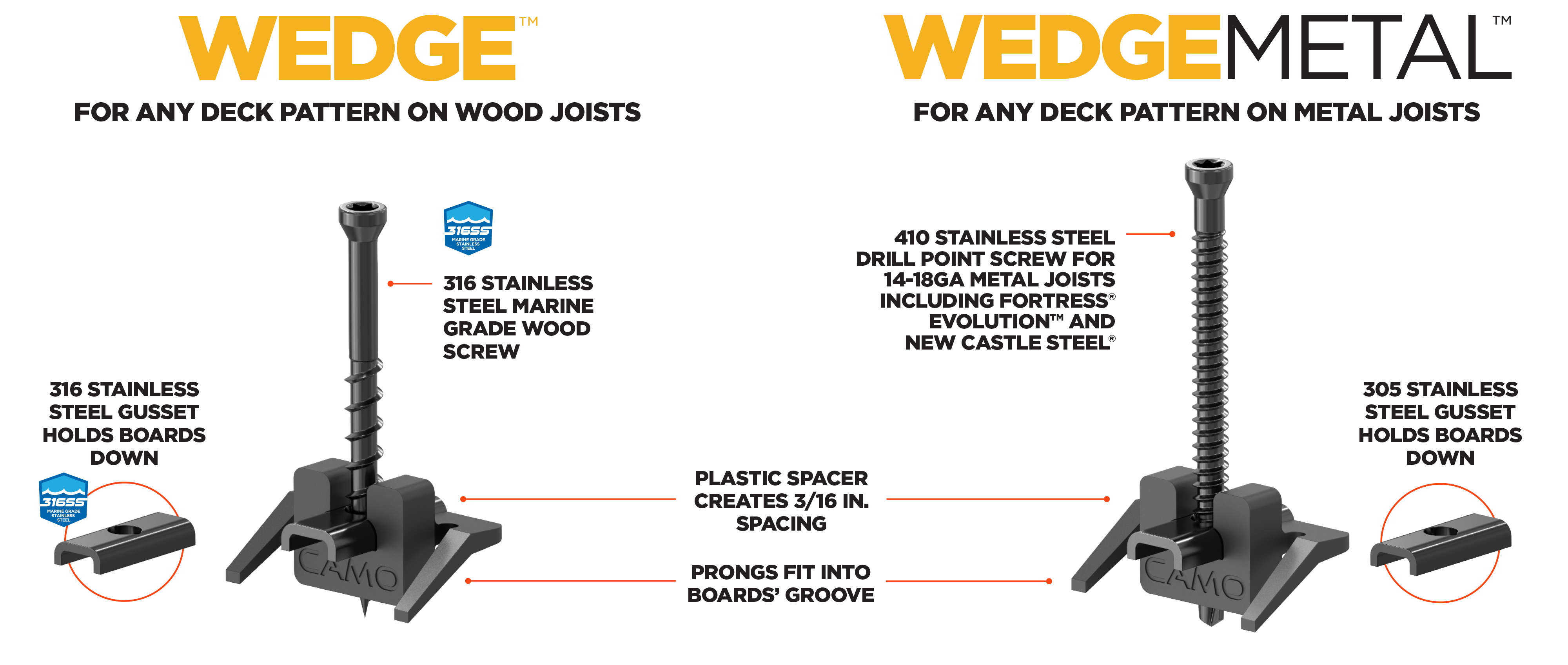 WEDGECLIP is warranted by CAMO for use with Trex®, TimberTech® by AZEK®, Fiberon®, MoistureShield®, Deckorators® & other leading brands